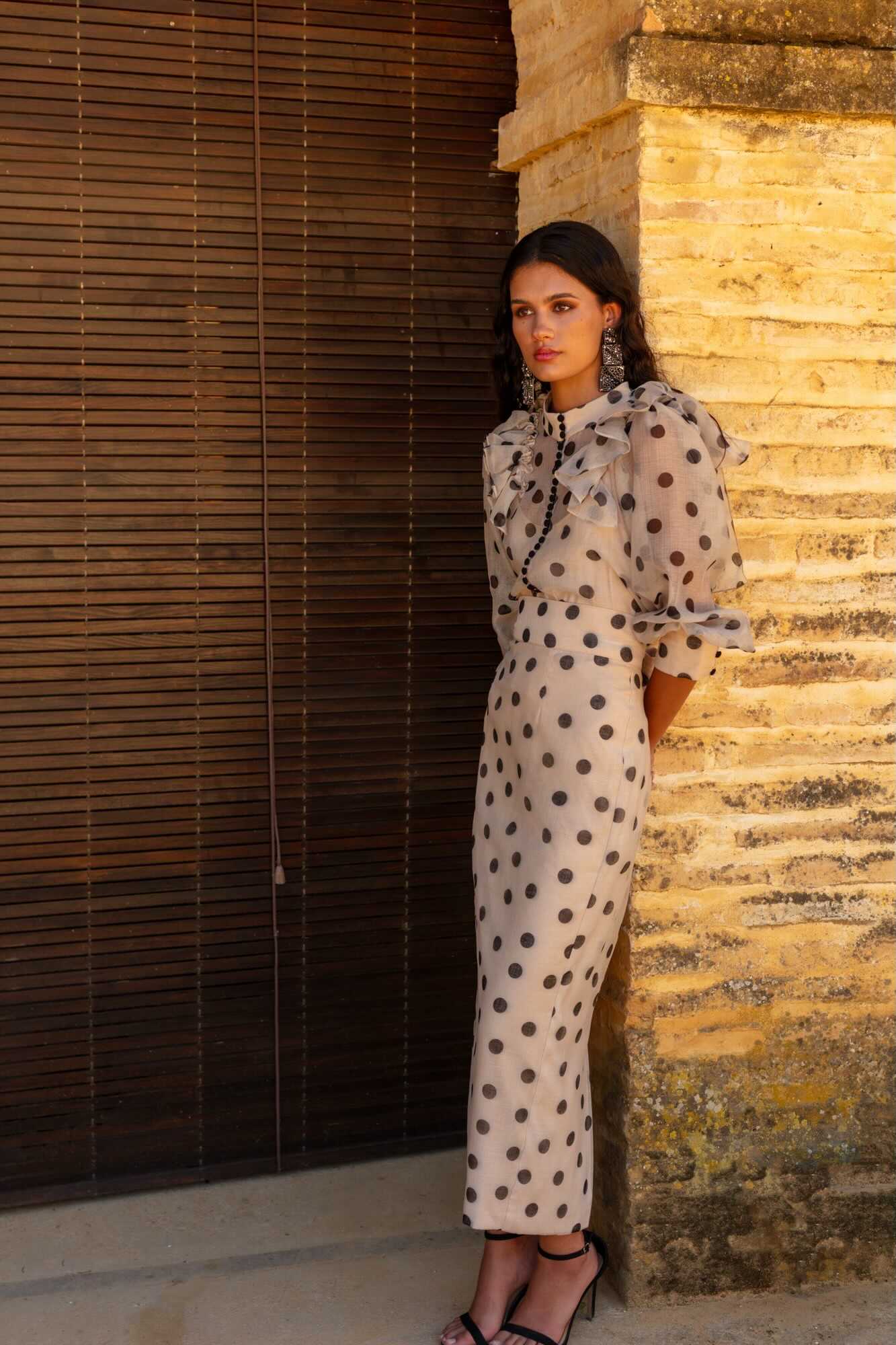 La atemporalidad del estampado de lunares se reinventa en esta falda midi confeccionada en Gaza, una prenda que combina frescura, sofisticación y estilo natural. Esta falda destaca por su silueta entallada que realza la figura con elegancia discreta.