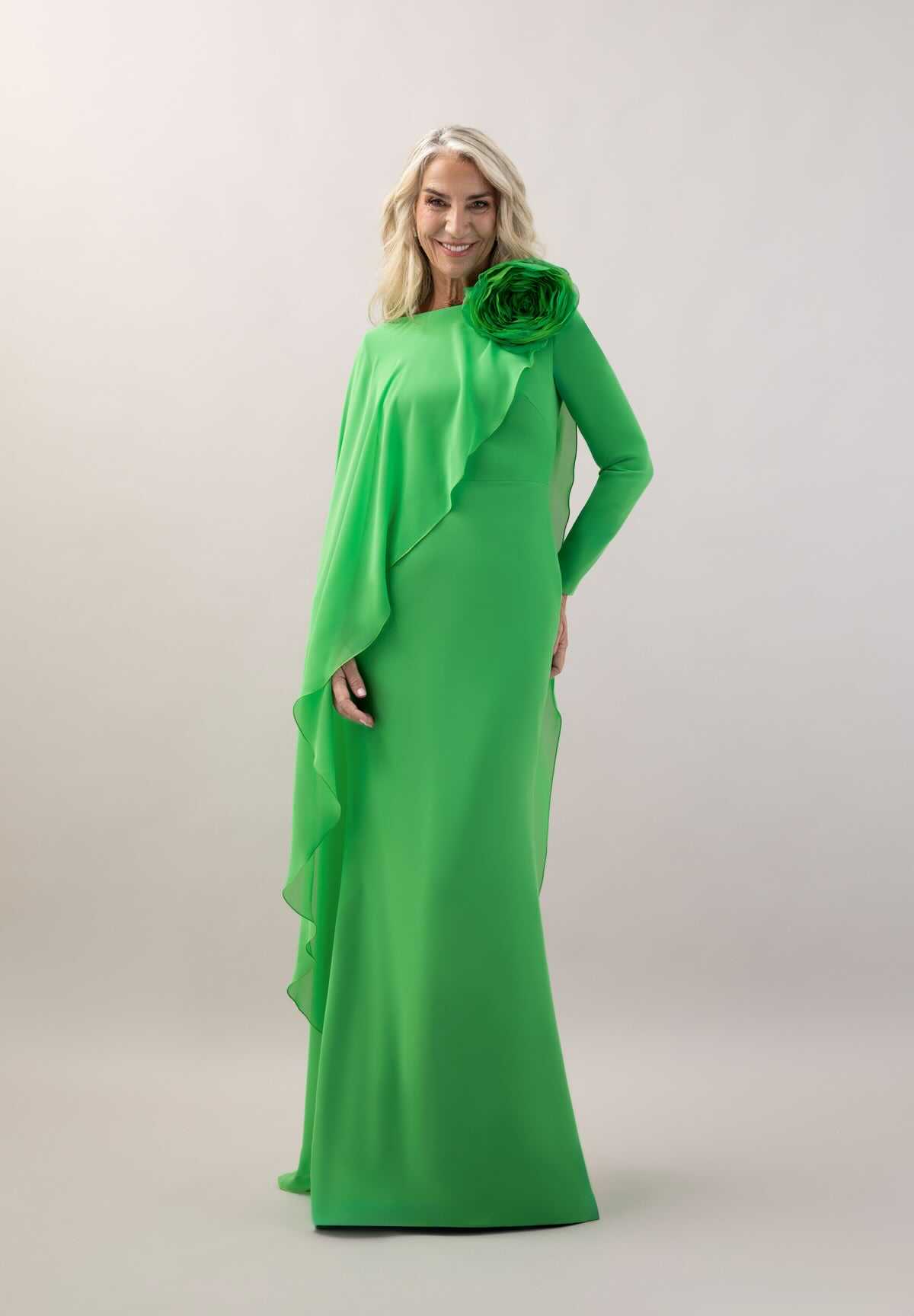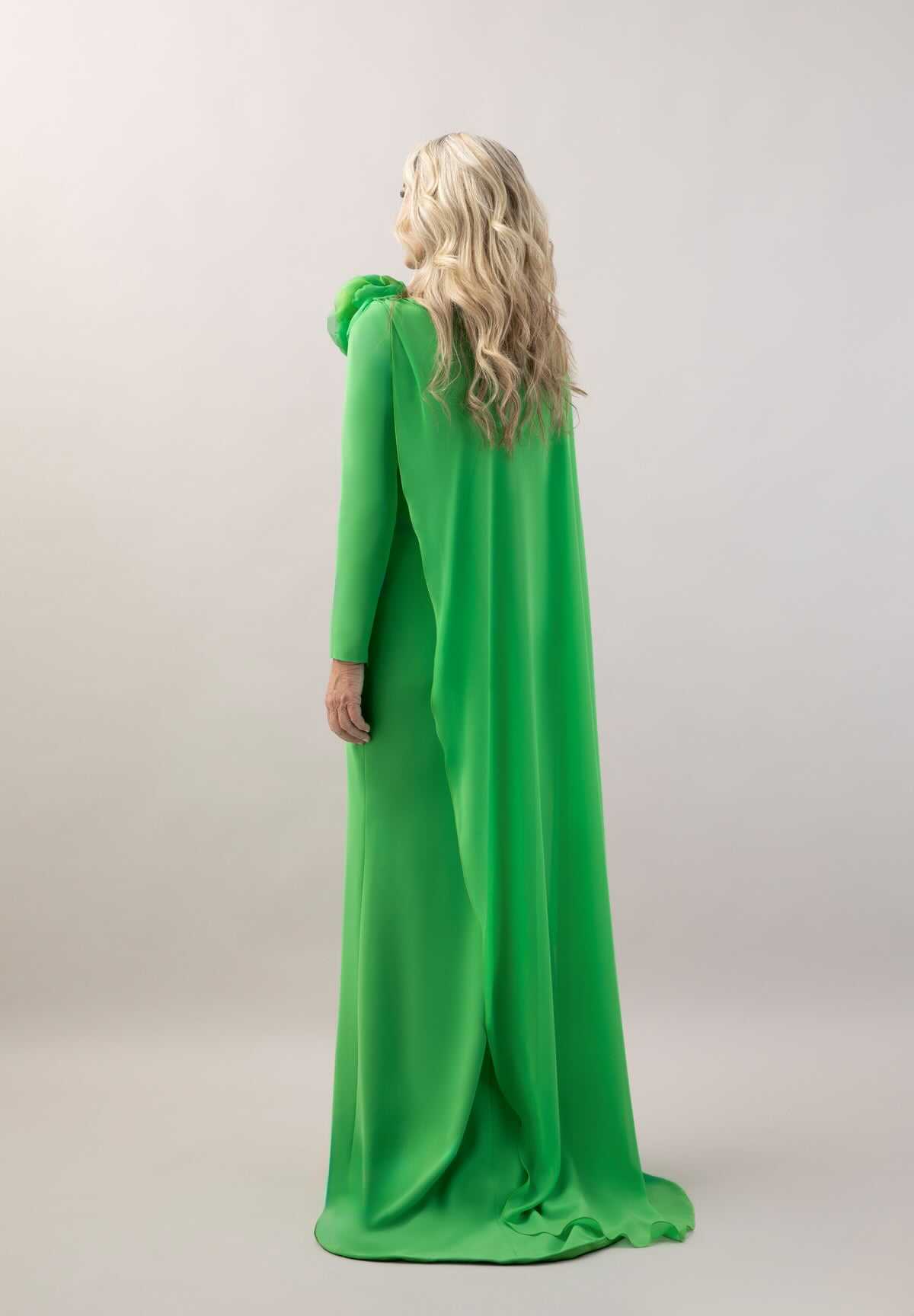 Capa de gasa asimétrica que cae en diagonal sobre el cuerpo delantero hasta el bajo de la espalda. Flor al tono realizada a mano sobre el hombro.