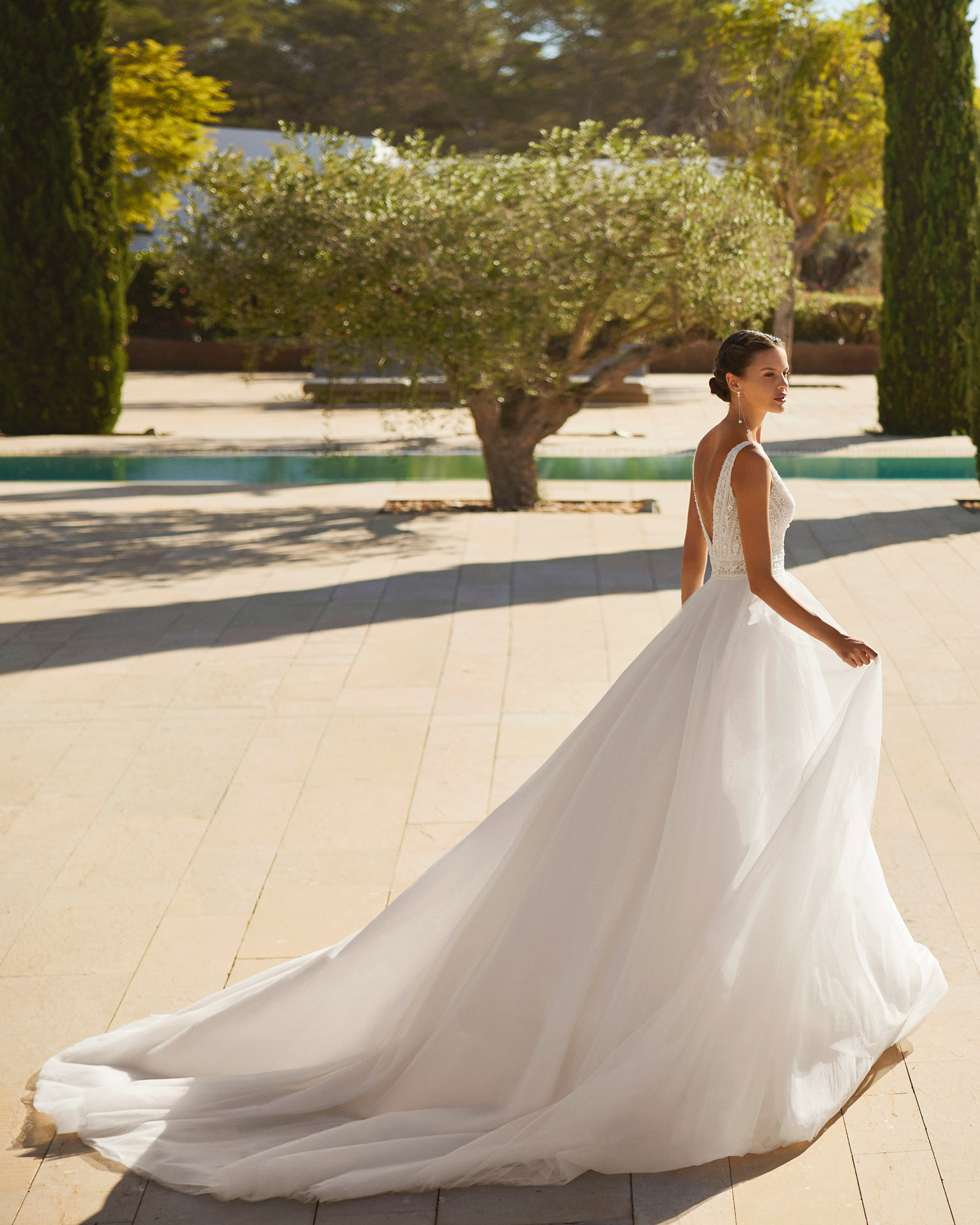 Vestido de novia largo de volumen en tul con cuerpo de encaje, pedrería, escote pico, tirantes y espalda en V.